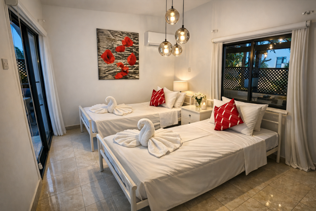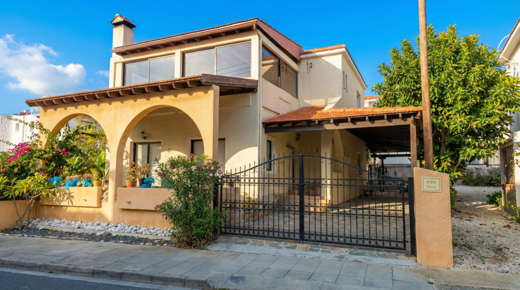 Step into a peaceful haven designed with traditional coastal architecture. Featuring beautiful classic arches, a private gated courtyard, and lush surroundings, Eleni Villa offers a warm and inviting atmosphere. Located just a short stroll from the beach, it is the perfect retreat for those seeking a cozy, authentic getaway.